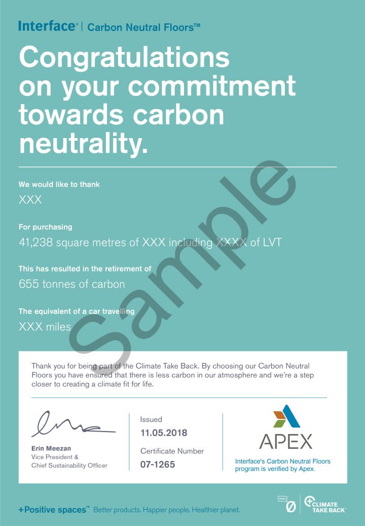 Odaberite Interface-ove karbonsko neutralne proizvode kako biste doprineli preokretu globalnog zagrevanja i dobili Interface-ov certifikat Carbon Neutral Floors ™ za doprinos vaše organizacije.