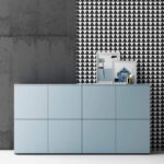 Konstrukcija je napravljena od melamina i upotpunjena je vratima i vrhovima dostupnim u različitim završnim obradama: melamin, sjajno i mat drvo.
