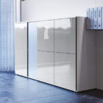 Takođe je moguće imati vrata od graviranog stakla spolja i farbanog stakla iznutra, debljine 6 mm, opremljena push-pull mehanizmom za otvaranje. Kombinacija staklenih vrata sa melaminskim i drvenim vratima stvara savršen kontrast u debljini i materijalima.
